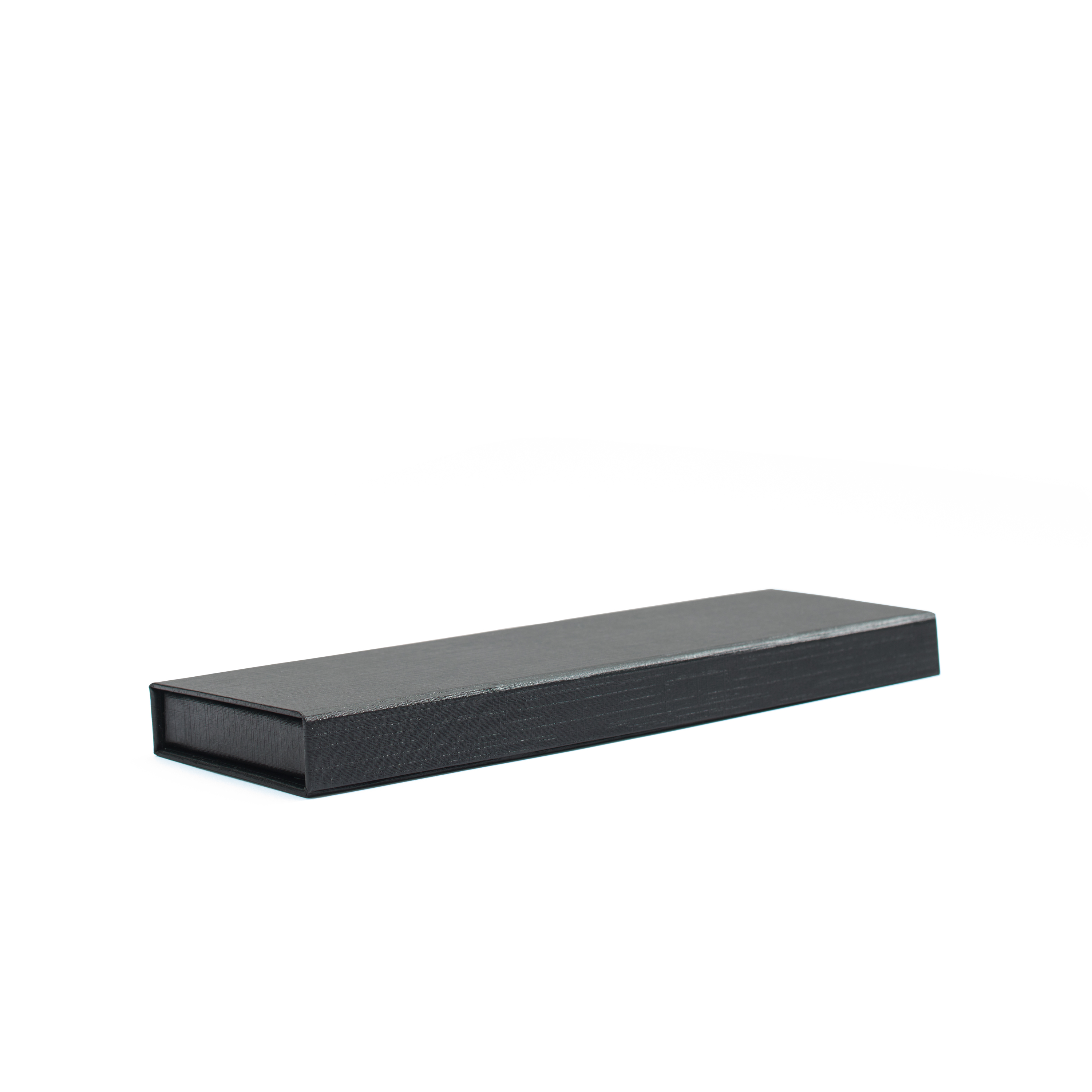 The box is made of extra-strong black cardboard with black velour interiort. A magnetic closure mechanism allows to tightly shut the box or to raise up its tray insert and keep in place at 45 degree angle.