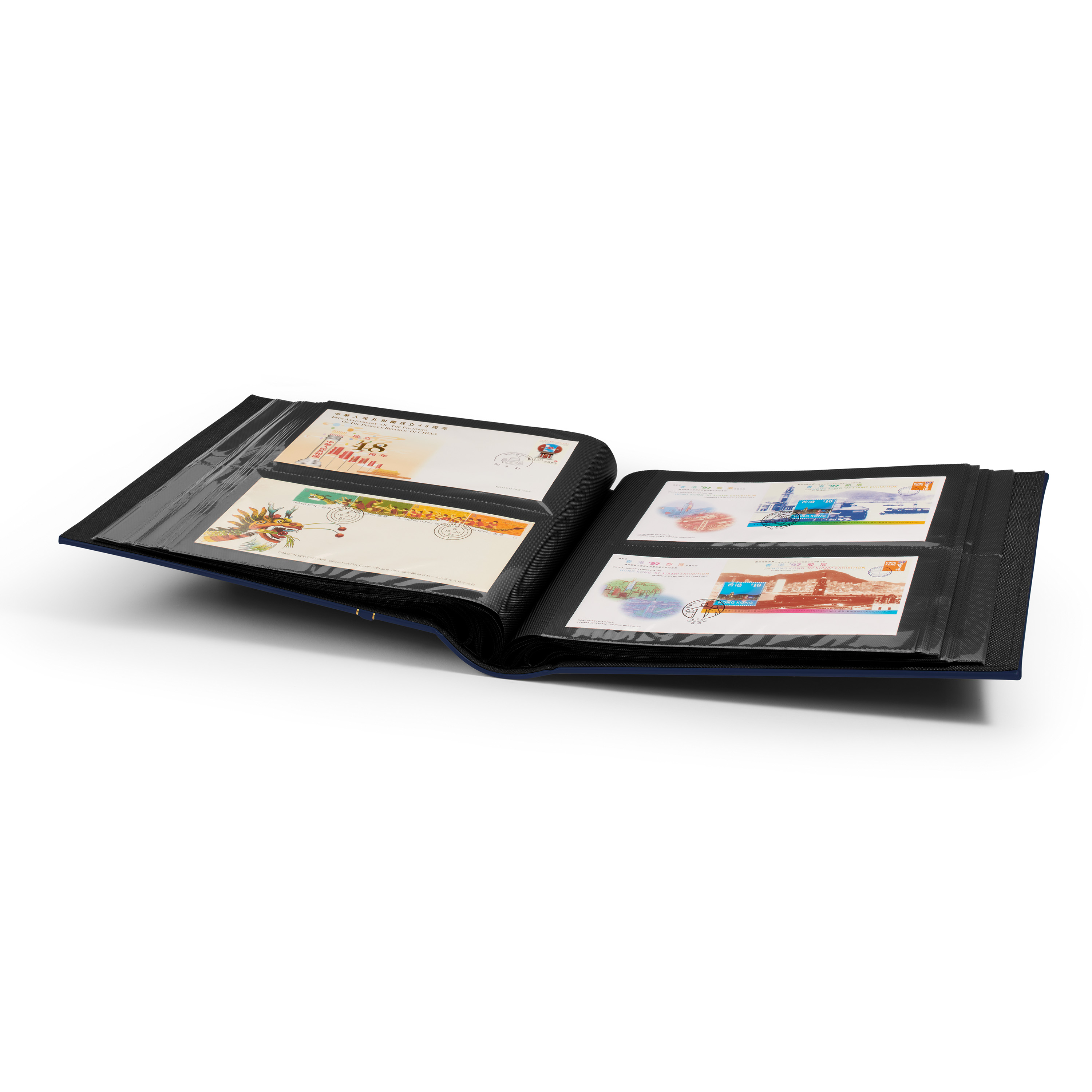 Album with 50 double-sided black inbound pages, free from acids or chemical softeners. 4 side-loading pockets per page which hold up to 200 covers, FDCs or postcards. Holds long covers including US No. 10 envelopes up to 9 1/2 x 5 14 '' (243 x 133 mm / DL covers). Matching slipcase included. Available in blue.
