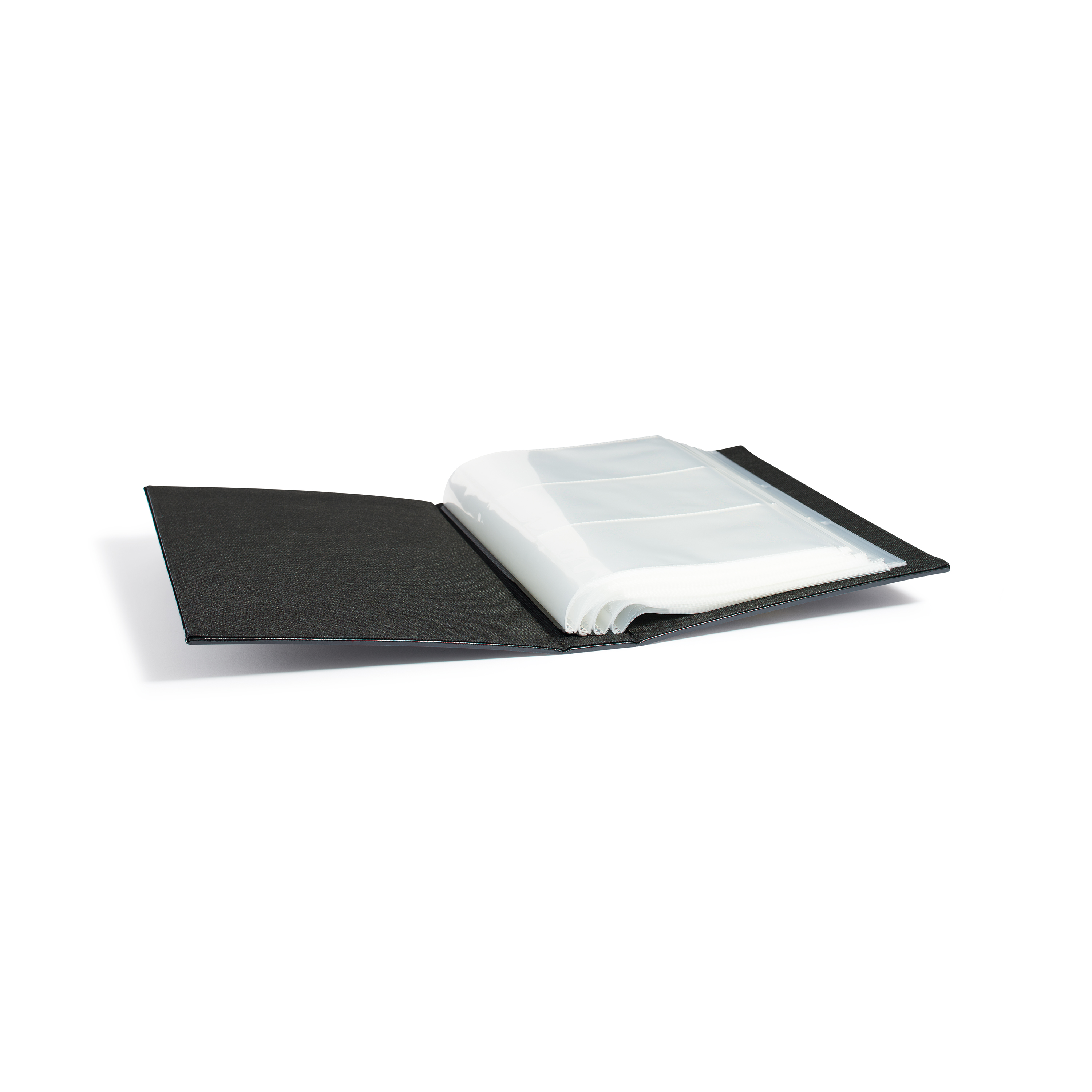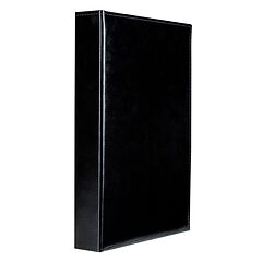 Elegant currency album in a timeless design. Black leatherette cover with 100 inbound clear polypropylene pages (free from PVC, acids, or chemical softners) to store and display up to 300 banknotes in style. Overall size: 9 1/2 x 13 x 2'' (245 x 330 x 50mm)