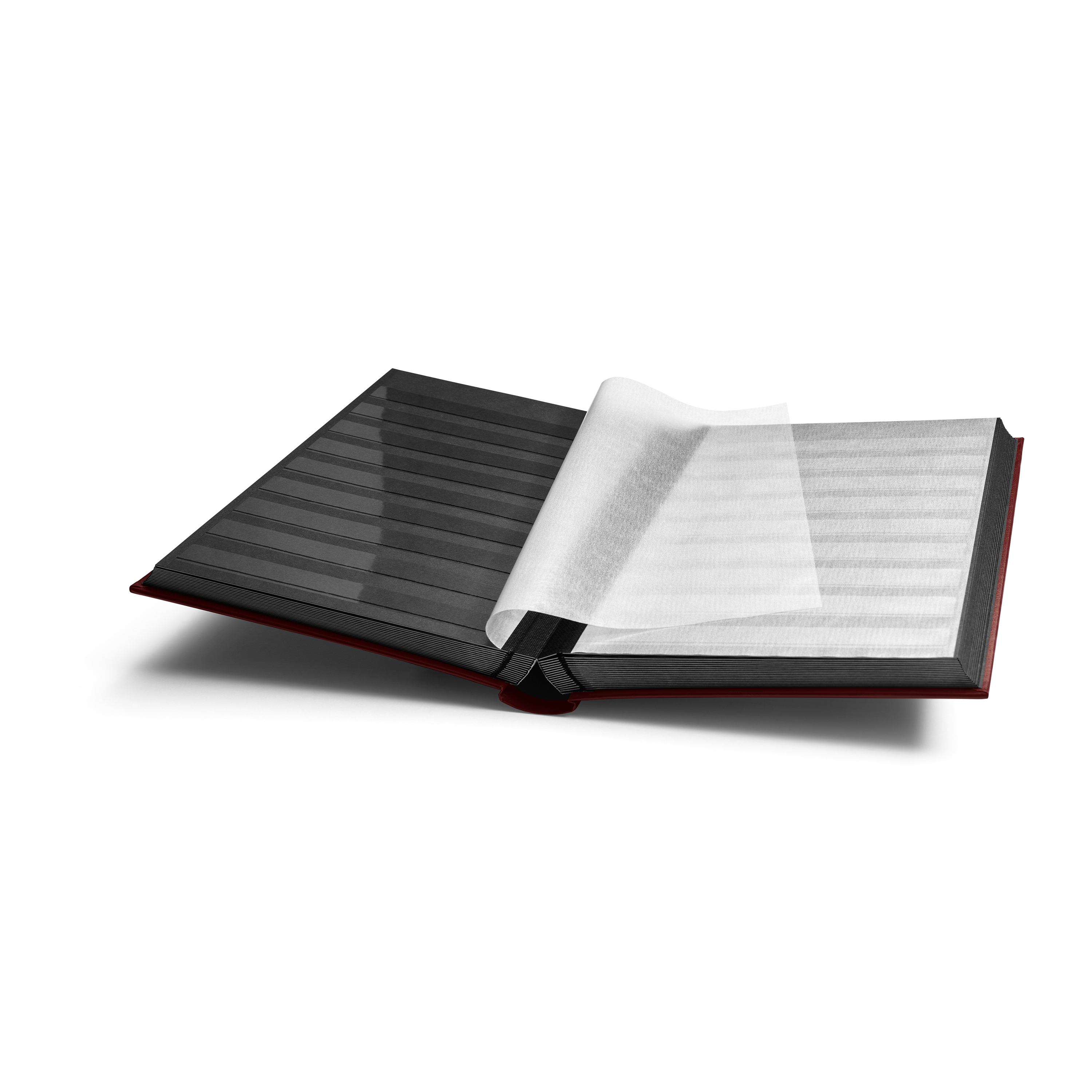 Item number: 313944Stock-Book A4 (9 x 12"), 64 black pages, clear stripes, glassine interleaving, padded cover, double linen hinged pages, red