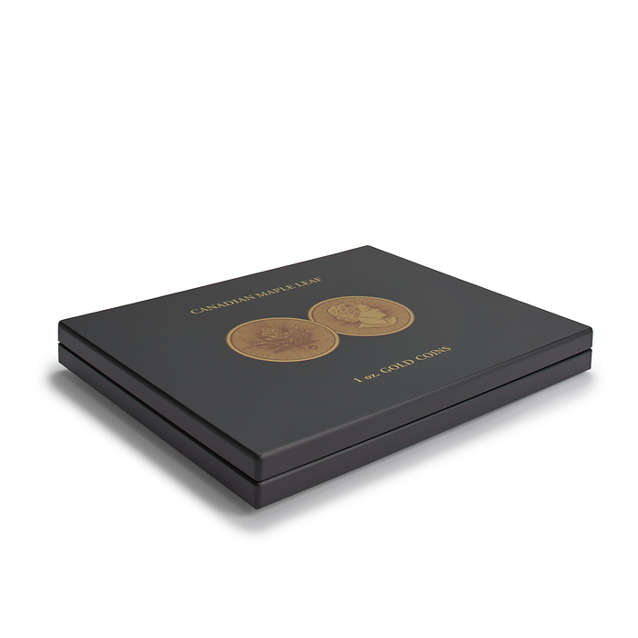 High-quality black coin cases for storing 30 Canadian Maple Leaf (1 oz.) gold coins in Leuchtturm capsules (Grip 30). One inlay with black velour-like surface and 30 round cavities. Noble gold-coloured lid and cushion with coin motif. Lid cushion upholstered in black satin. Secure and unobtrusive magnet closure. Outer format: 305 x 30 x 245 mm