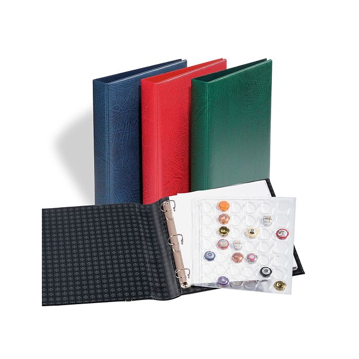 Padded, textured leatherette cover, sturdy 3 D-ring mechanism, comes with 4 ENCAP CHAMP pages for up to 168 champagne or bottle caps, dimensions: 11 1/8 x 12 1/2 x 1 3/4" (297 x 320 x 44 mm).