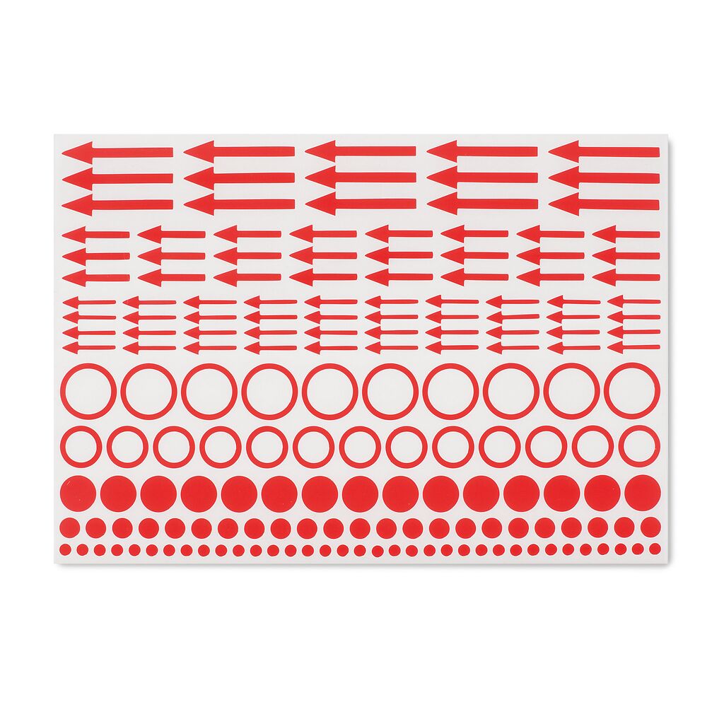 Item number: 357473Indicator labels: bright red self-adhesive labels, ideal for highlighting special features, include various arrows, circles, and dots, pack of 10