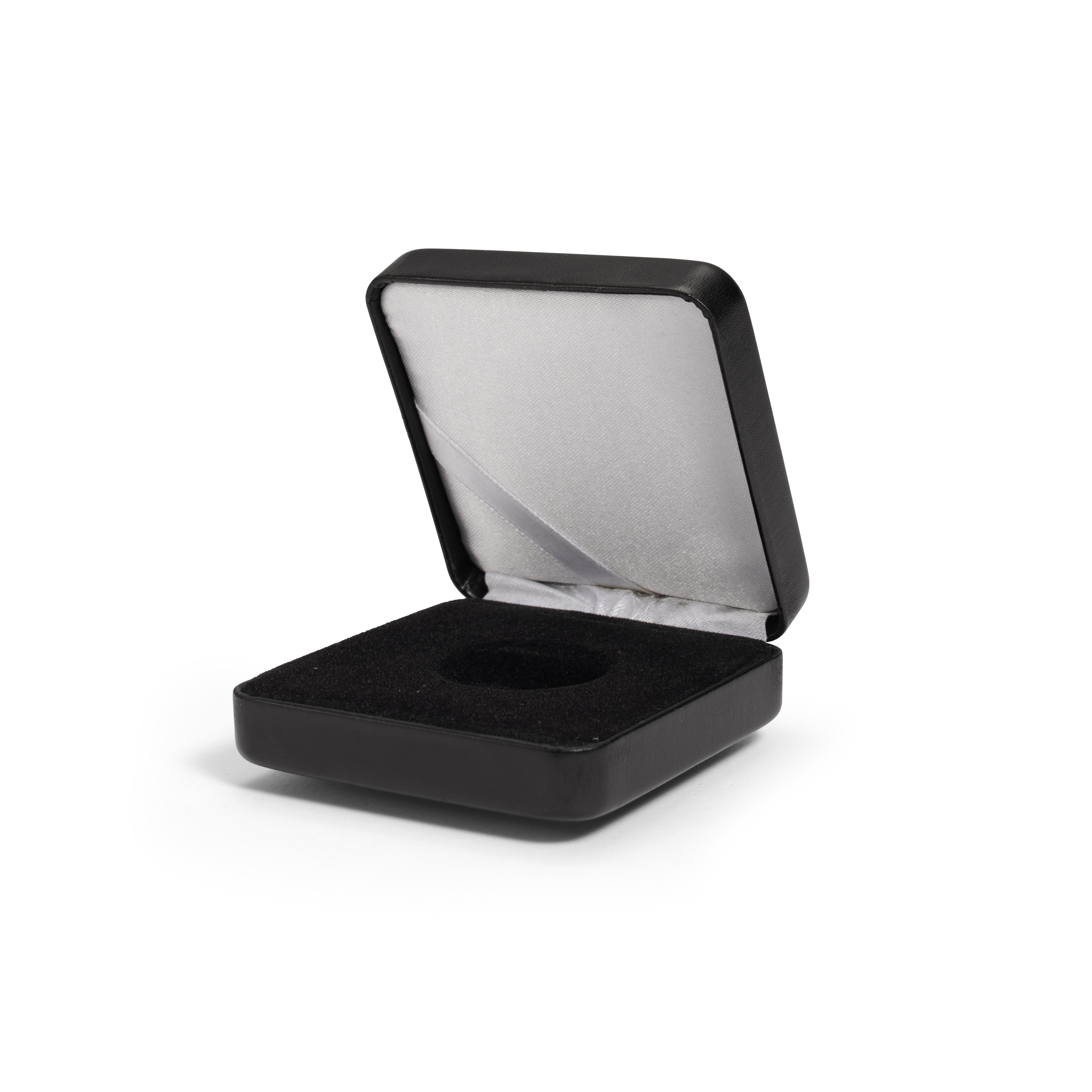 For the most elegant yet affordable presentation of encapsulated coins we recommend these high-quality coin boxes with silk-lined lid and black velvet inlay. A satin ribbon inside the lid can hold a personal message if desired. A sturdy metal frame protects the coin and is covered with matt black leatherette. Holds LIGHTHOUSE CAPS18, 19, 20 or other capsules up to 26mm outside diameter. Perfect for Dimes and Pennies in capsules.