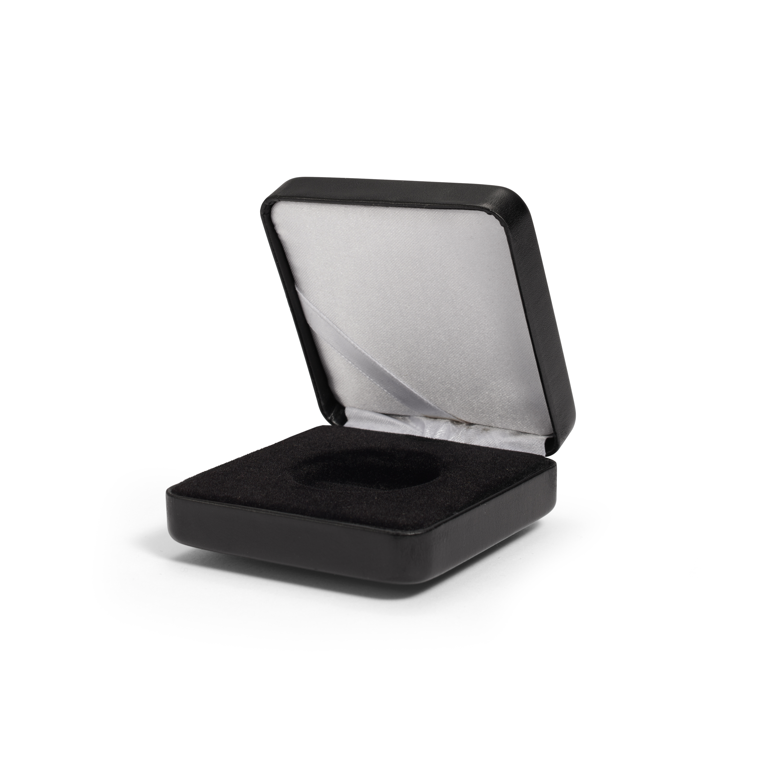 For the most elegant yet affordable presentation of encapsulated coins we recommend these high-quality coin boxes with silk-lined lid and black velvet inlay. A satin ribbon inside the lid can hold a personal message if desired. A sturdy metal frame protects the coin and is covered with matt black leatherette. Holds LIGHTHOUSE CAPS25, 26 or other capsules up to 32mm outside diameter.