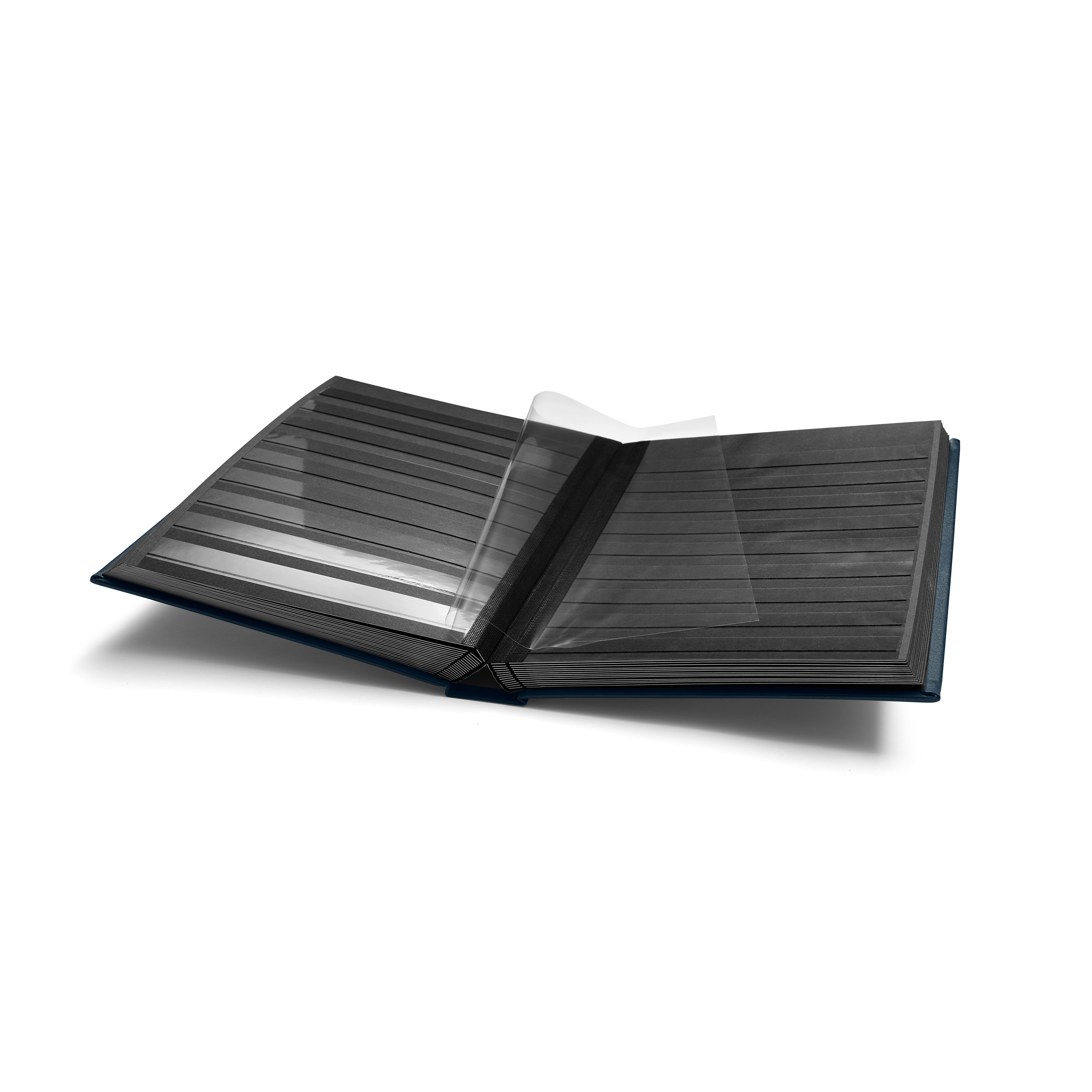 Stockbook with special film free from chemical softeners and double interleaves and double hinge binding. Format A4 with 64 black pages and 9 clear strips per page. Padded cover. Available in 4 colours.