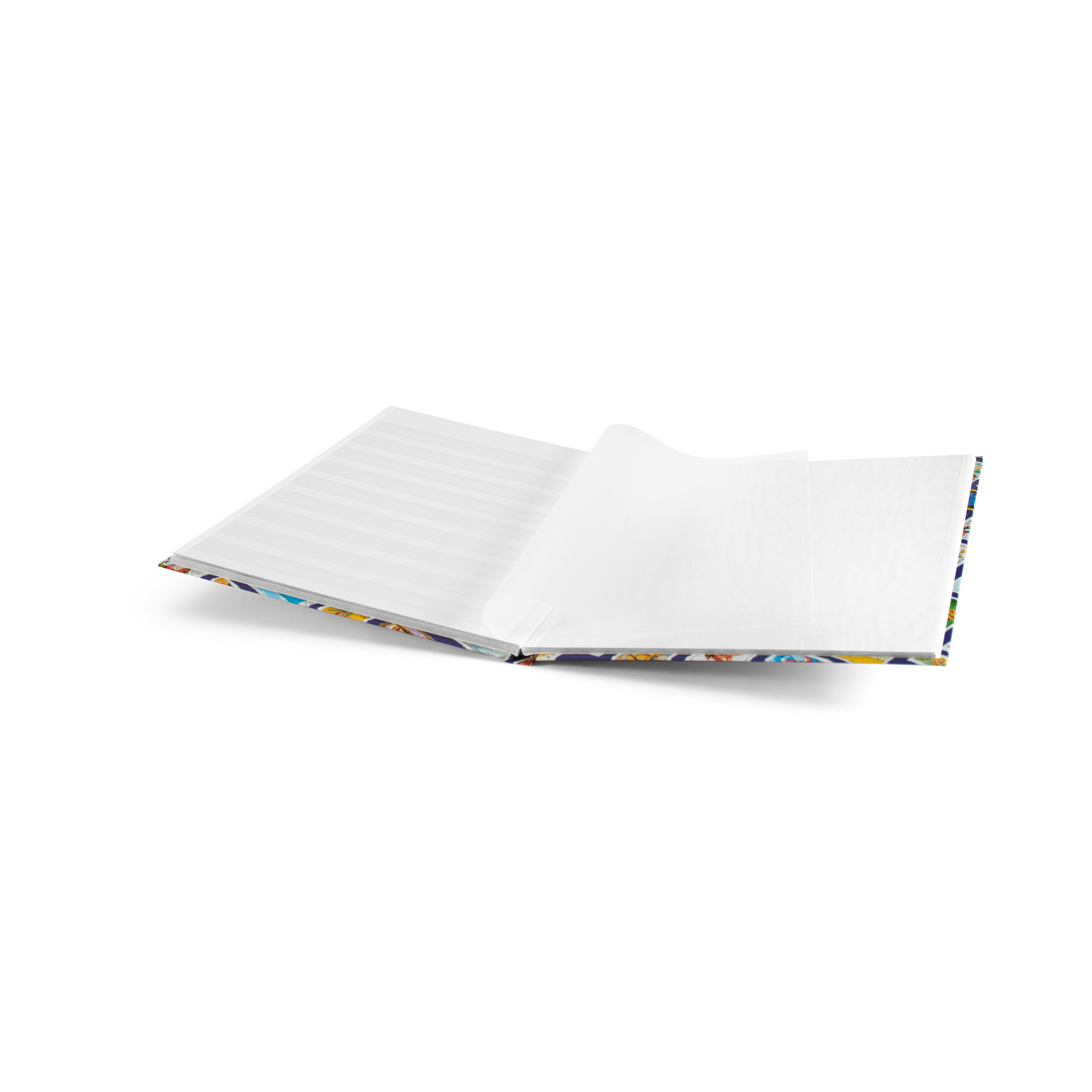 A4 Stock Book (9 x 12 in), non-padded cover with stamp motifs, 16 white card stock pages, 9 glassine strips per page, single glassine interleaving, rigid binding.