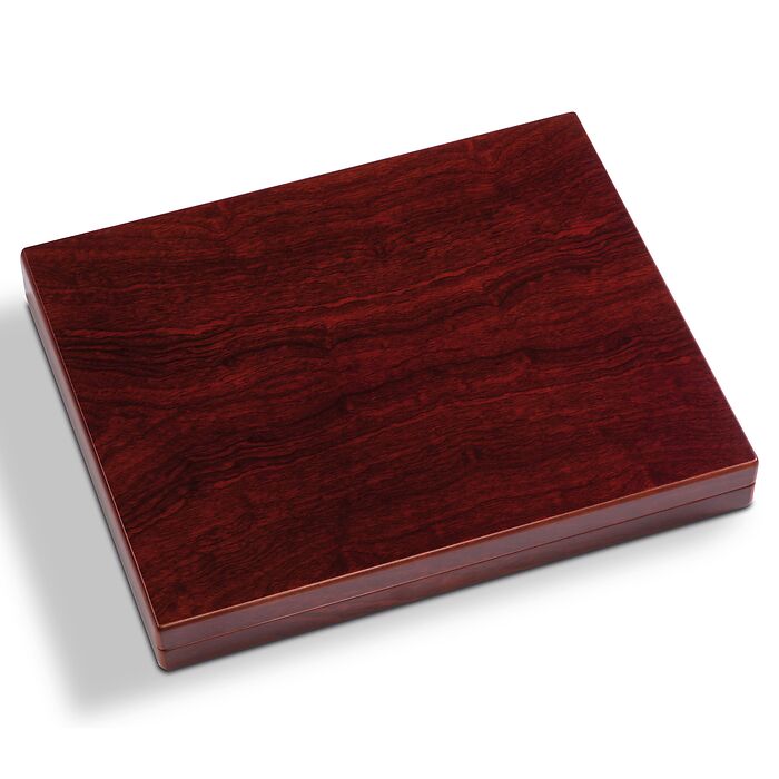 VOLTERRA UNO presentation case for 20 MAGNICAPS capsules. Mahogany wood grain finish with black velour insert. Solid construction. Gold-plated hinges. Secure magnetic closure.